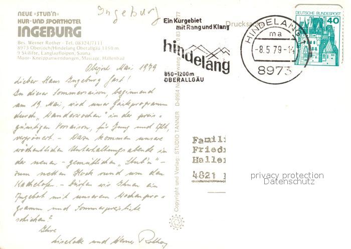 73116064 alte Postkarte Hindelang Neue Stubn Kur Sporthotel Ingeburg postalisch gelaufen Erhaltung siehe scans [KathaD81] KatCode: 11110009780123