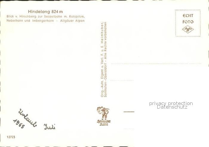 72454290 Hindelang Sesselbahn Rotspitze Nebelhorn Entschenkopf Sonnenkoepfe postalisch nicht gelaufen Erhaltung siehe scans KatCode: 11110009780123