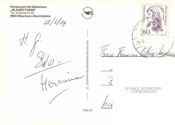 72859711 alte Postkarte Hinrichsfehn Restaurant Gaestehaus Blauer Fasan postalisch gelaufen Erhaltung siehe scans [NatalD47] KatCode: 11110003452025