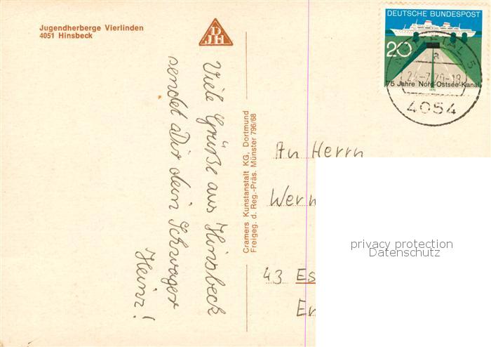 73813270 alte Postkarte Hinsbeck Jugendherberge Vierlinden Fliegeraufnahme postalisch gelaufen Erhaltung siehe scans [WerneD78] KatCode: 11110005166016