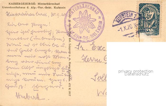 43078006 alte Postkarte Hinterbaerenbad Kaisergebirge Unterkunftshaus Sektion Kufstein postalisch gelaufen Erhaltung siehe scans [WerneD78] KatCode: 11390332070368