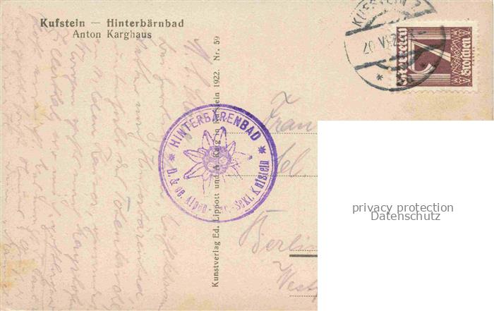 74032702 alte Postkarte Hinterbaernbad KUFSTEIN Tirol AT Anton Karghaus Alpen postalisch gelaufen Erhaltung siehe scans [FriedD77] KatCode: 11390335070513
