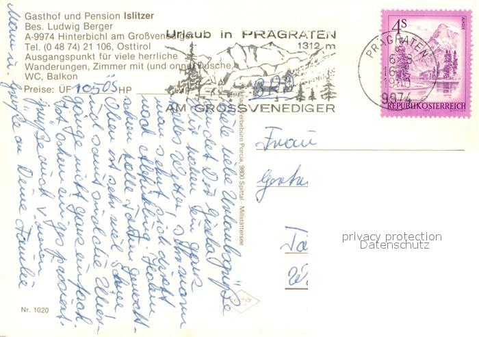 73591914 alte Postkarte Hinterbichl Praegraten Gasthof Pension Islitzer Landschaftspanorama Alpen Wasserfall postalisch gelaufen Erhaltung siehe scans [FriedD77] KatCode: 11390333070723