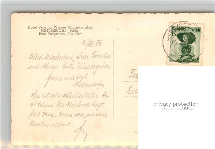 43051689 alte Postkarte Hinterbichl Praegraten Hotel-Pension Saengerknaben postalisch gelaufen Erhaltung siehe scans [PaolaD17] KatCode: 11390333070723