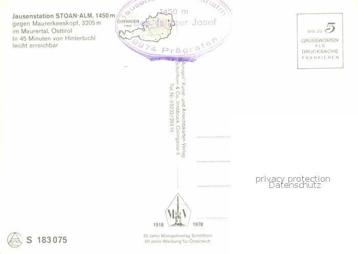 72759688 Hinterbichl Praegraten Jausenstation Stoan Alm Maurerkeeskopf postalisch nicht gelaufen Erhaltung siehe scans [KathaD81] KatCode: 11390333070723