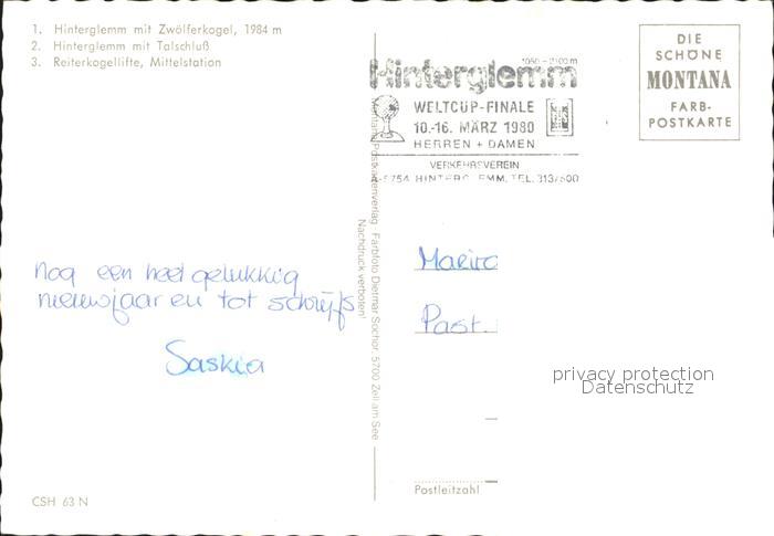 72270803 alte Postkarte Hinterglemm Saalbach Gesamtansicht Wintersportplatz mit Zwoelferkogel Reiterkogellifte Alpenpanorama postalisch gelaufen Erhaltung siehe scans KatCode: 11390