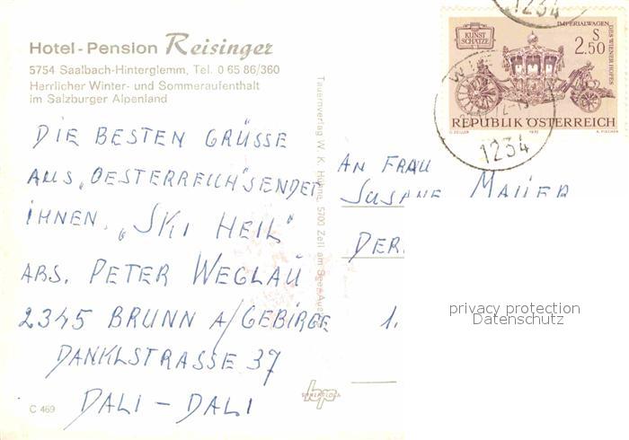 72667637 alte Postkarte Hinterglemm Saalbach Hotel Reisinger postalisch gelaufen Erhaltung siehe scans [AndreD76] KatCode: 11390