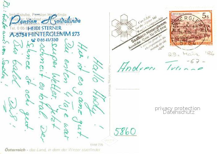 72901719 alte Postkarte Hinterglemm Saalbach Imbisstube Pension Heidelinde Wintersportplatz Allgaeuer Alpen postalisch gelaufen Erhaltung siehe scans [FriedD77] KatCode: 11390