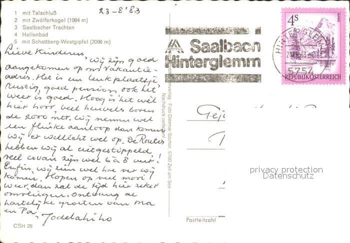 72092221 alte Postkarte Hinterglemm Saalbach mit Talschluss Zwoelferkogel Trachten Hallenbad Schattberg Westgipfel postalisch gelaufen Erhaltung siehe scans KatCode: 11390