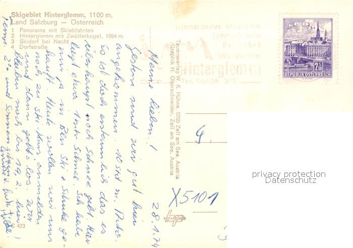 73592055 alte Postkarte Hinterglemm Saalbach Panorama Zwoelferkogel Skidorf bei Nacht Dorfstrasse postalisch gelaufen Erhaltung siehe scans [WerneD78] KatCode: 11390
