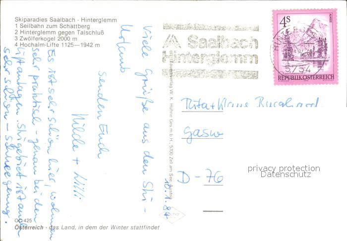 72436358 alte Postkarte Hinterglemm Saalbach Seilbahn zum Schattberg Talschluss Zwoelferkogel Hochalm Lifte postalisch gelaufen Erhaltung siehe scans KatCode: 11390