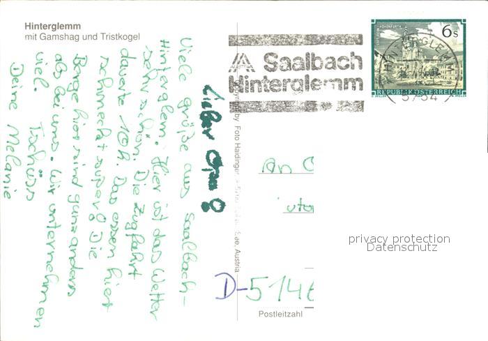 72450567 alte Postkarte Hinterglemm Saalbach Teilansicht mit Gamshang und Tristkogel postalisch gelaufen Erhaltung siehe scans KatCode: 11390
