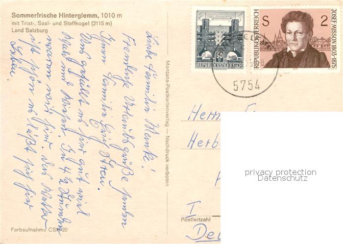 72930654 alte Postkarte Hinterglemm Saalbach Trist- Saal- Staffkogel postalisch gelaufen Erhaltung siehe scans [NatalD47] KatCode: 11390