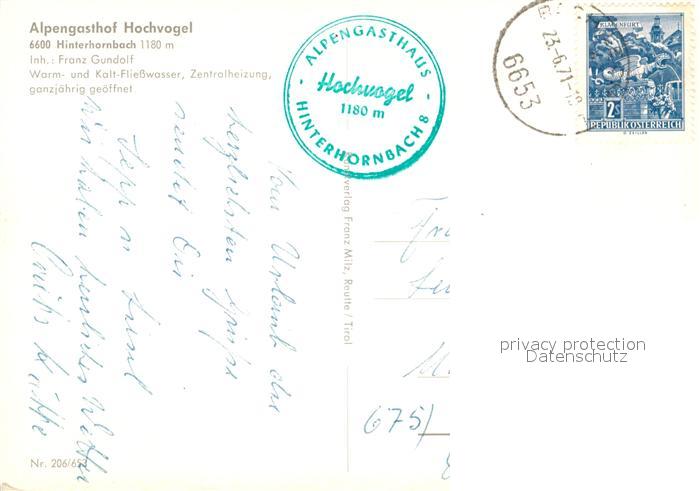 73234944 alte Postkarte Hinterhornbach Alpengasthof Hochvogel postalisch gelaufen Erhaltung siehe scans [FriedD77] KatCode: 11390331070815