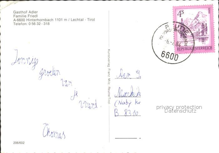 72022940 alte Postkarte Hinterhornbach Gasthof Adler postalisch gelaufen Erhaltung siehe scans KatCode: 11390331070815