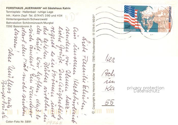 73664524 alte Postkarte Hinterlangenbach Baiersbronn Forsthaus Auerhahn mit Gaestehaus Katrin postalisch gelaufen Erhaltung siehe scans [WerneD78] KatCode: 11110008237004