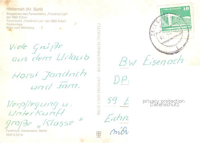 72972749 alte Postkarte Hinternah Bungalows Ferienheim Friedrich Lust Parkanlage Blick vom Muehlberg postalisch gelaufen Erhaltung siehe scans [FriedD77] KatCode: 11110016069059