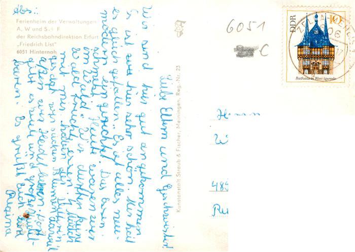 73907563 alte Postkarte Hinternah Ferienheim der Verwaltungen der Reichsbahndirektion Erfurt Friedrich List postalisch gelaufen Erhaltung siehe scans [FriedD77] KatCode: 11110016069059