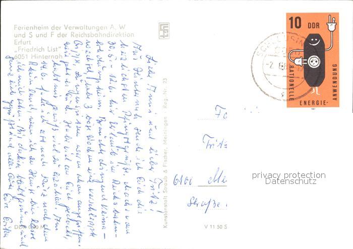 72073588 alte Postkarte Hinternah Ferienheim Reichsbahndirektion Erfurt postalisch gelaufen Erhaltung siehe scans KatCode: 11110016069059