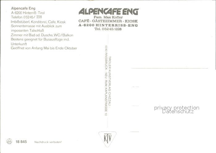 72266393 Hinterriss Tirol Alpencafe Eng postalisch nicht gelaufen Erhaltung siehe scans KatCode: 11390335070936
