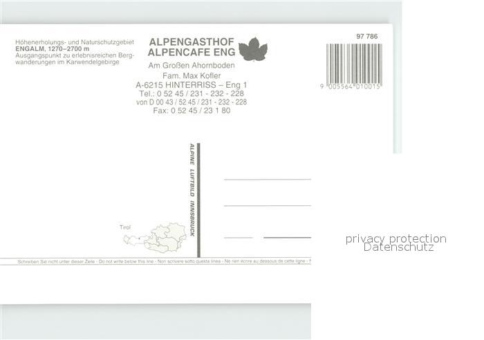 72023306 Hinterriss Tirol Alpengasthof Alpencafe Eng postalisch nicht gelaufen Erhaltung siehe scans KatCode: 11390335070936