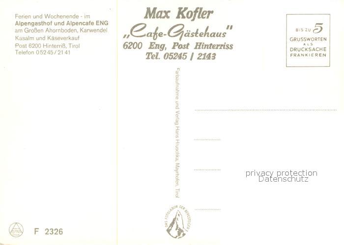 73363000 Hinterriss Tirol Alpengasthof Cafe Eng Grosser Ahornboden Karwendelgebirge Almvieh Kuehe Kasalm Bruecke postalisch nicht gelaufen Erhaltung siehe scans [FriedD77] KatCode: 11390335070936