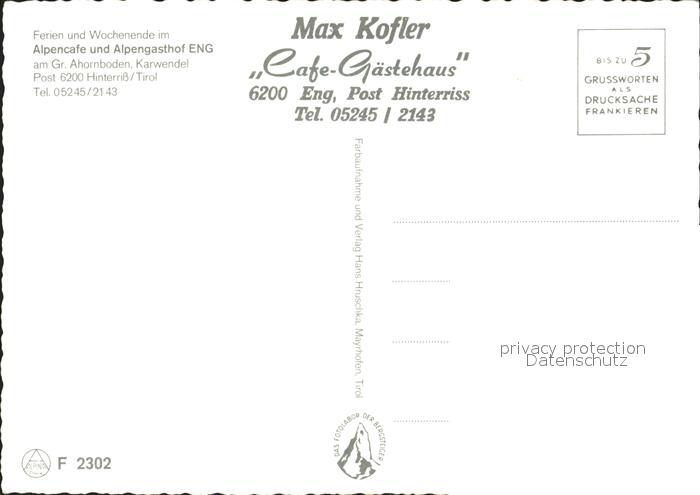 72184849 Hinterriss Tirol Alpengasthof Eng postalisch nicht gelaufen Erhaltung siehe scans KatCode: 11390335070936