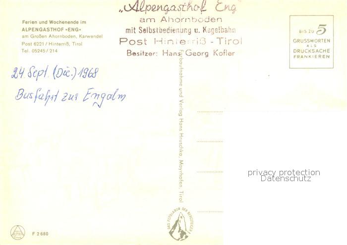 73613042 Hinterriss Tirol Alpengasthof Eng am Grossen Ahornboden Gastraum postalisch nicht gelaufen Erhaltung siehe scans [FriedD77] KatCode: 11390335070936