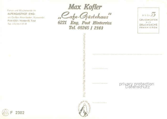73642855 Hinterriss Tirol Alpengasthof Eng Landschaftspanorama Grosser Ahornboden Bruecke Alpen postalisch nicht gelaufen Erhaltung siehe scans [FriedD77] KatCode: 11390335070936