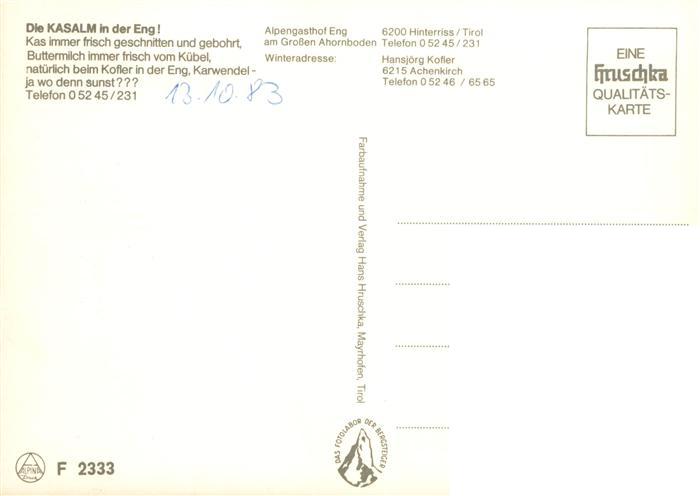 73925172 Hinterriss Tirol AT Alpengasthof Eng Kasalm postalisch nicht gelaufen Erhaltung siehe scans [WerneD78] KatCode: 11390335070936