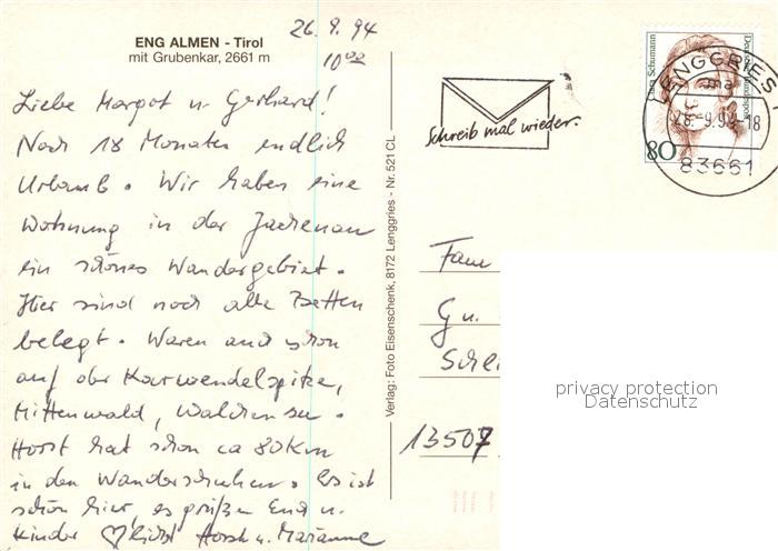 73100971 alte Postkarte Hinterriss Tirol Eng Almen mit Grubenkar postalisch gelaufen Erhaltung siehe scans [WerneD78] KatCode: 11390335070936