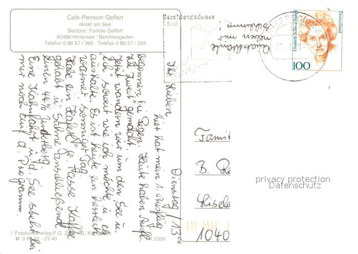 73731189 alte Postkarte Hintersee Berchtesgaden Cafe Pension Gelfart am See Gastraum Kamin Terrasse Alpen postalisch gelaufen Erhaltung siehe scans [FriedD77] KatCode: 11110009172129