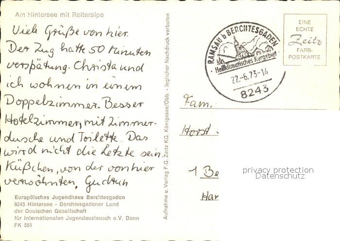 72398444 alte Postkarte Hintersee Berchtesgaden Reiteralpe postalisch gelaufen Erhaltung siehe scans KatCode: 11110009172129
