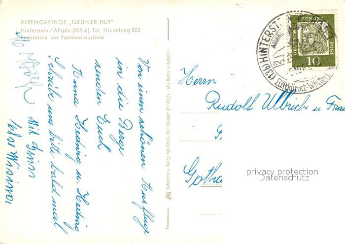 73110435 alte Postkarte Hinterstein Bad Hindelang Alpengasthof Gruener Hut postalisch gelaufen Erhaltung siehe scans [NatalD47] KatCode: 11110009780123