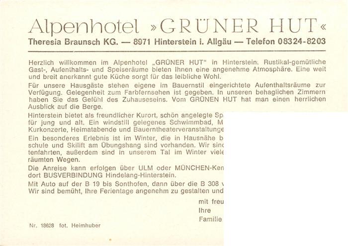 73884009 Hinterstein Bad Hindelang Alpenhotel Gruener Hut Fruehstuecksraum Gaestezimmer Speiserestraurant postalisch nicht gelaufen Werbekarte (keine Postkarte) Erhaltung siehe scans [WerneD78] KatCode: 11110009780123