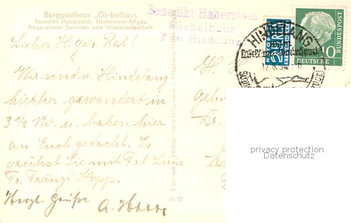 73804113 alte Postkarte Hinterstein Bad Hindelang Berggasthof Giebelhaus Hintersteinertal postalisch gelaufen Erhaltung siehe scans [FriedD77] KatCode: 11110009780123