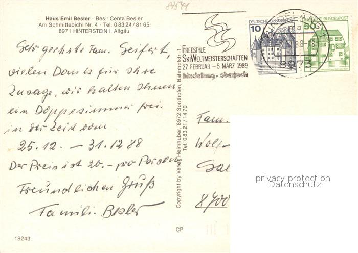 73648971 alte Postkarte Hinterstein Bad Hindelang Gaestehaus Pension Haus Emil Besler Allgaeuer Alpen postalisch gelaufen Erhaltung siehe scans [FriedD77] KatCode: 11110009780123