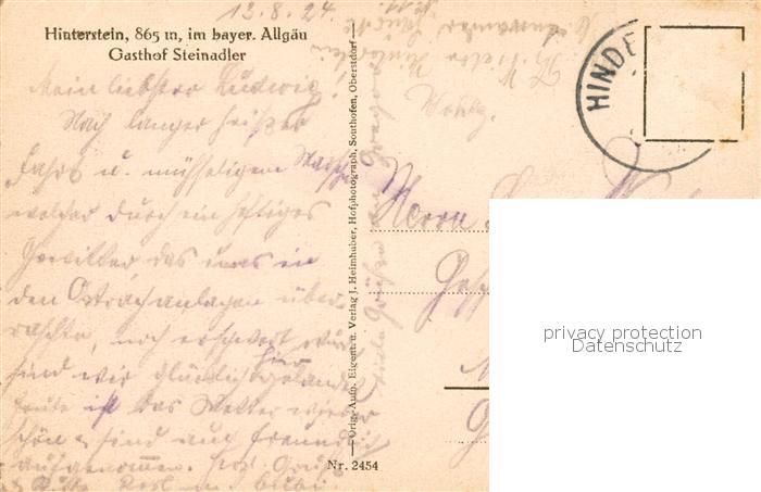 73803347 alte Postkarte Hinterstein Bad Hindelang Gasthof Steinadler postalisch gelaufen Erhaltung siehe scans [WerneD78] KatCode: 11110009780123