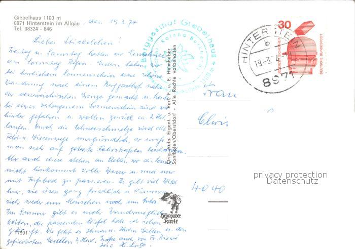 72288445 alte Postkarte Hinterstein Bad Hindelang Giebelhaus postalisch gelaufen Erhaltung siehe scans KatCode: 11110009780123