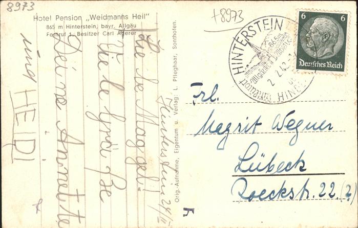 40994949 Hinterstein Bad Hindelang Hotel Pension Weidmannsheil postalisch gelaufen Alte Ansichtskarte Postkarte alte Postkarte Katcode 11110009780123
