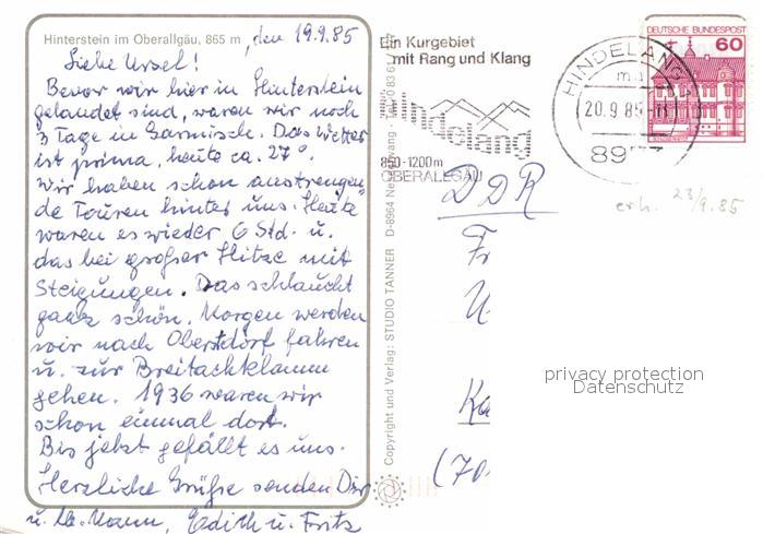 72615476 alte Postkarte Hinterstein Bad Hindelang mit Kugelhorn aelpelekopf Schaenzlespitze postalisch gelaufen Erhaltung siehe scans [WerneD78] KatCode: 11110009780123