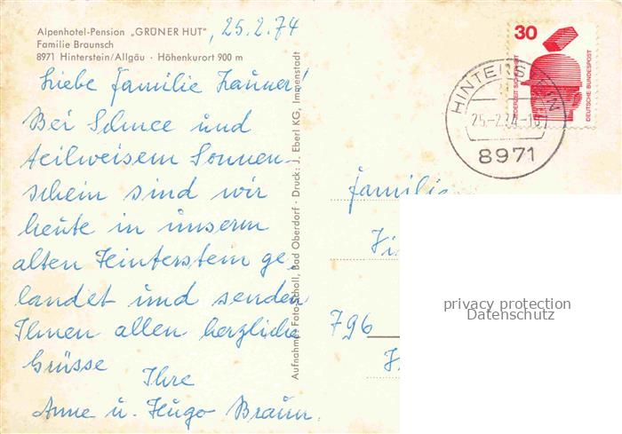 74130249 alte Postkarte Hinterstein Bad Hindelang Oberallgaeu Bayern Alpenhotel Pension Gruener Hut postalisch gelaufen Erhaltung siehe scans [FriedD77] KatCode: 11110009780123
