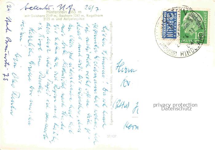 74152202 alte Postkarte Hinterstein Bad Hindelang Oberallgaeu Bayern mit Geishorn Rauhorn Kugelhorn und Aelpelespitze postalisch gelaufen Erhaltung siehe scans [WerneD78] KatCode: 11110009780123