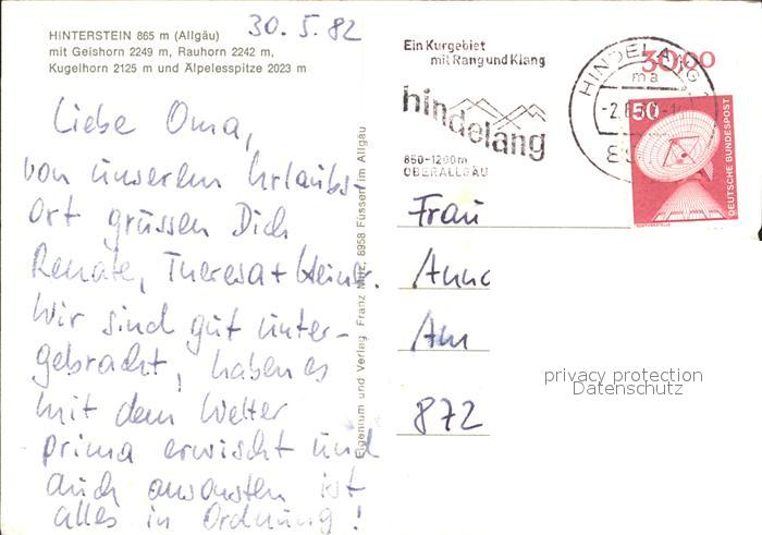 72255529 alte Postkarte Hinterstein Bad Hindelang Panorama mit Allgaeuer Alpen postalisch gelaufen Erhaltung siehe scans KatCode: 11110009780123