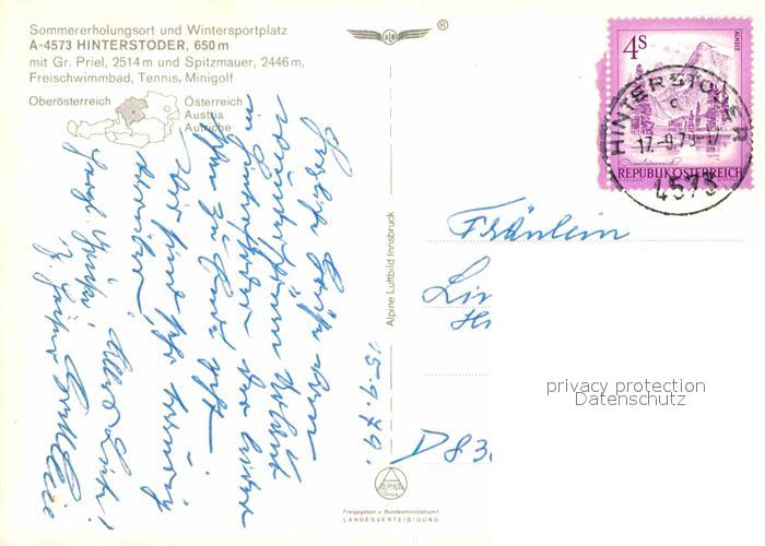72618603 alte Postkarte Hinterstoder Panorama Sommererholungsort Wintersportplatz Grosser Priel Spitzmauer Totes Gebirge Fliegeraufnahme postalisch gelaufen Erhaltung siehe scans [FriedD77] KatCode: 11390314040903
