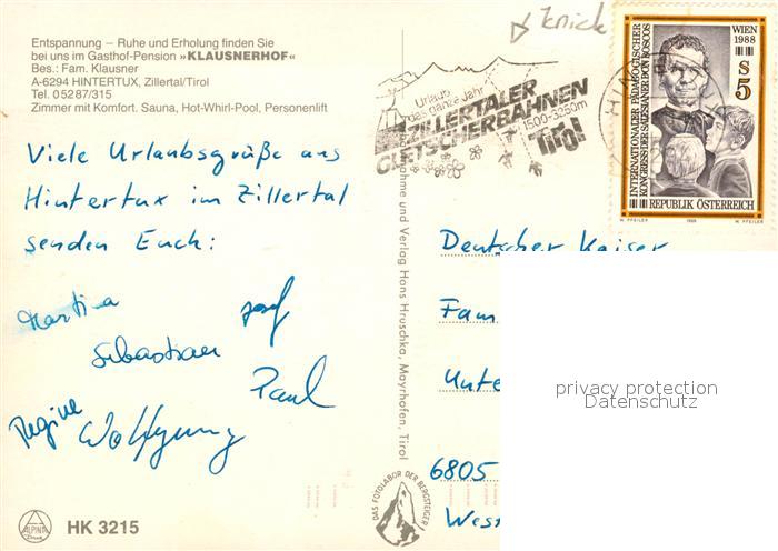 73070486 alte Postkarte Hintertux Zillertal Gasthof Pension Klausnerhof postalisch gelaufen Erhaltung siehe scans [FriedD77] KatCode: 11390335070934