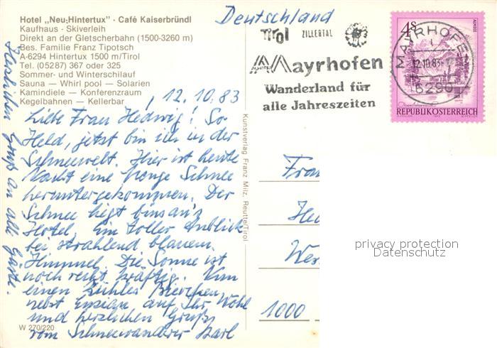 73663423 alte Postkarte Hintertux Zillertal Hotel Neu-Hintertux Caf? Kaiserbr?ndl postalisch gelaufen Erhaltung siehe scans [LiesaD40] KatCode: 11390335070934