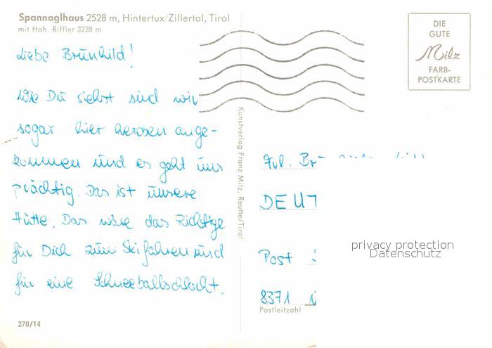 72653565 alte Postkarte Hintertux Zillertal Spannagelhaus mit Hohem Riffler postalisch gelaufen Erhaltung siehe scans [WerneD78] KatCode: 11390335070934