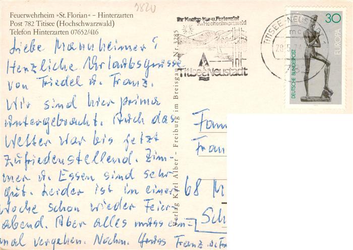 73929417 Hinterzarten Breisgau-Hochschwarzwald BW Feuerwehrheim St Florian Gastraum Terrasse Panorama postalisch gelaufen Erhaltung siehe scans [WerneD78] alte Postkarte Wern Katcode 11110008315052