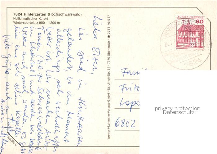 73866251 Hinterzarten Breisgau-Hochschwarzwald BW Fliegeraufnahme postalisch gelaufen Erhaltung siehe scans [WerneD78] alte Postkarte Wern Katcode 11110008315052